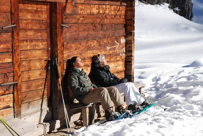 Vous n’irez pas dans les Dolomites uniquement pour skier. Sorties randonnées en raquettes à neige ou bien, une simple sortie comme nous l’avons fait ce dimanche pour manger au restaurant d’altitude et prendre un peu le soleil, sont d’autres possibilités agréables sans se ruiner