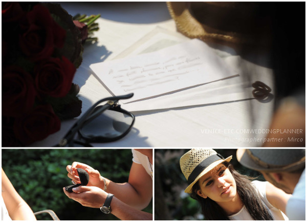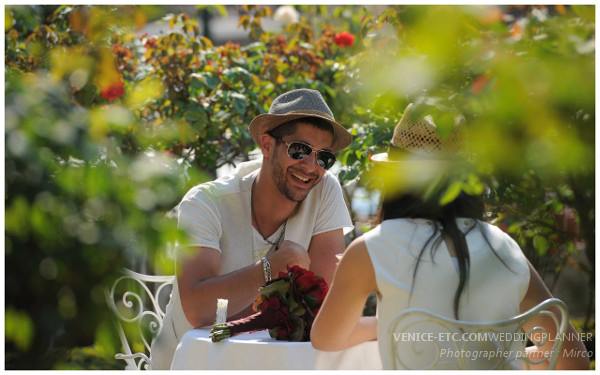 Bonjour,Alors pour les commentaires j’ai vraiment rien à dire tout a été parfait, ma fiancée a été ravie de cette surprise. Tout y était du beau temps jusqu’au bouquet de fleurs en passant par le violoniste et la Terraza Danieli…. mais quelle vue ? vraiment magnifique. On s’en souviendra longtemps de cette journée. Bon il est vrai que le premier bateau (aéroport-centre de Venise) était en retard de 20 min, je me suis dit que cela n’envisageait rien de bon…. Je n’ai pas beaucoup aimé le premier restaurant où nous avons pris le petit déjeuner : la cuisine était succulente (mais vraiment succulente) mais la vue n’était pas très belle et que dire du personnel ? désagréable, hautain, ne faisait même pas l’effort de parler Anglais. Je ne le conseillerais que pour l’assiette. Bon c’est vite oublié par la beauté de Venise et les moments agréables que nous avons passé. Au lieu de visiter les monuments, nous avons décidés de visiter toute l’île à pied, ce qui était très agréable vu le temps. Sinon la demande en mariage était parfaite, le personnel était au petit soins avec nous, le barman vraiment trés gentil. Il a vu que le premier cocktail ne nous a plus (pas très fan du gingembre), il nous en a donc refait un succulent.Le photographe était adorable, professionnel, souriant donc rien à dire.